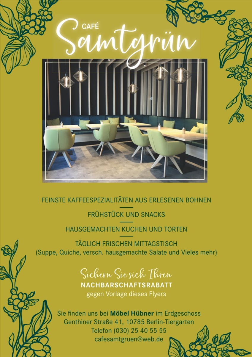 Welcome to Café Samtgrün, a delightful gem nestled in Berlin at Genthiner Str. 41. This cozy café captures the essence of modern comfort with its warm ambiance and meticulous attention to detail. Visitors rave about the cleanliness and friendly service, making it an inviting spot for all.